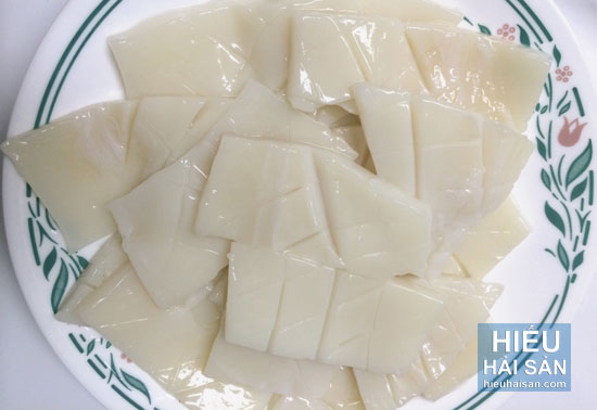 – Mực sơ chế rửa sạch rồi cắt rời phần đầu mực. Sau đó dùng muối xoa đều lên thân mực và lột bỏ lớp màng mỏng bên ngoài. Dùng khăn sạch lau khô mực, cắt dọc theo thân mực rộng khoảng 2-3cm.