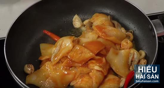 - Vì mực đã được chần sơ nên bạn chỉ cần xào nhanh tay trên bếp khoảng 3 phút là được, mực vừa chín tới sẽ có được độ giòn ngon, không nên xào chín quá sẽ mất đi độ giòn của mực đấy.