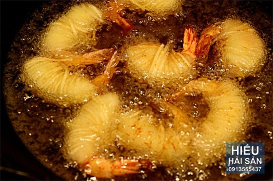 - Đặt chảo lên bếp, làm nóng dầu. Khi dầu ăn đủ nóng thì thả tôm vào chiên. Chiên với lửa vừa đến khi mì vàng giòn, tôm chuyển sang màu đỏ là được. Vớt tôm để ráo dầu.