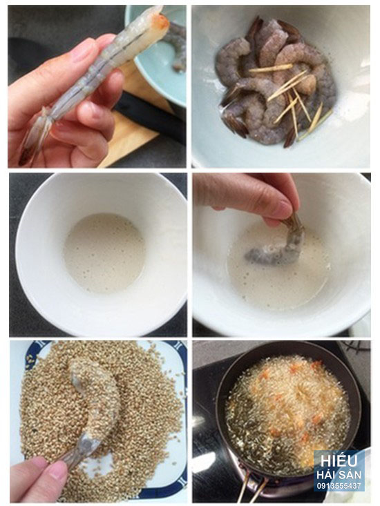 - Nhúng tôm vào hỗn hợp vừa trộn cho ướt rồi lăn qua một lớp vừng trắng áo ngoài. Làm nóng chảo với lượng dầu đủ ngập tôm. Chờ dầu vừa sôi thì thả tôm vào chiên cho đến khi ngả màu vàng nâu thì vớt tôm ra đĩa, để trên dĩa vài miếng giấy thấm dầu cho tôm chiên được ráo.