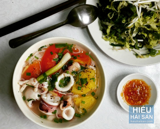 - Bạn cho một ít bún vào tô lớn, rắc ít hành, rau mùi đã thái nhỏ lên trên và cho một chút giá lên trên. Thêm chả mực rán và mực tươi bạn đã xào để riêng vào và chan nước dùng lên trên. Hãy ăn kèm với rau xà lách, rau thơm nhé.